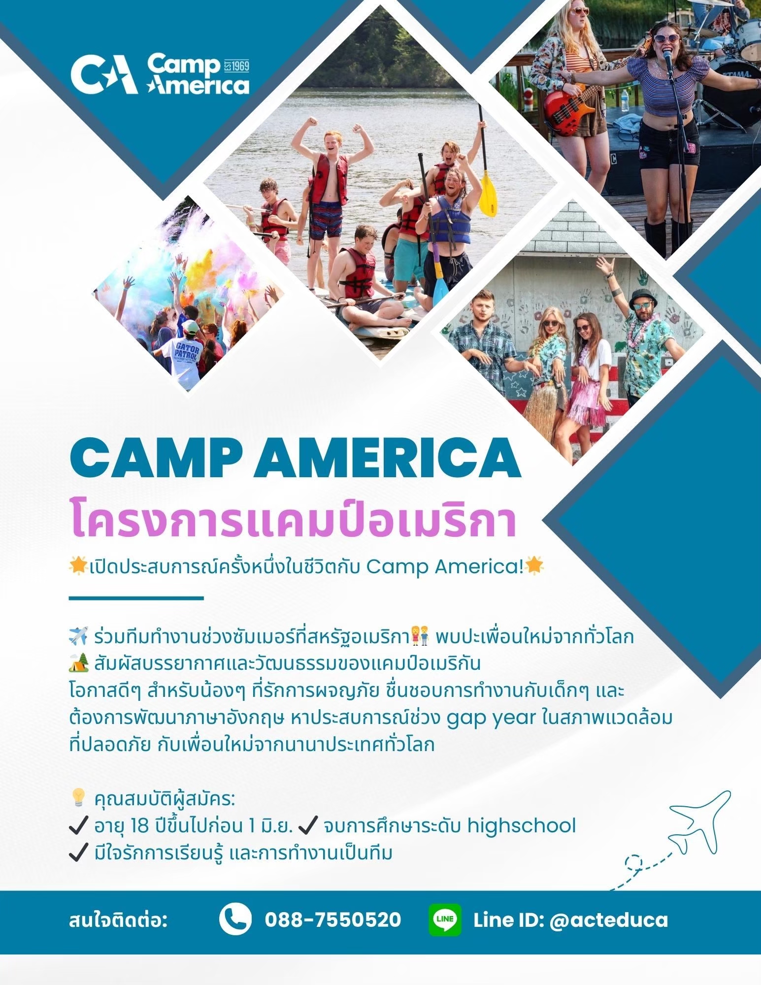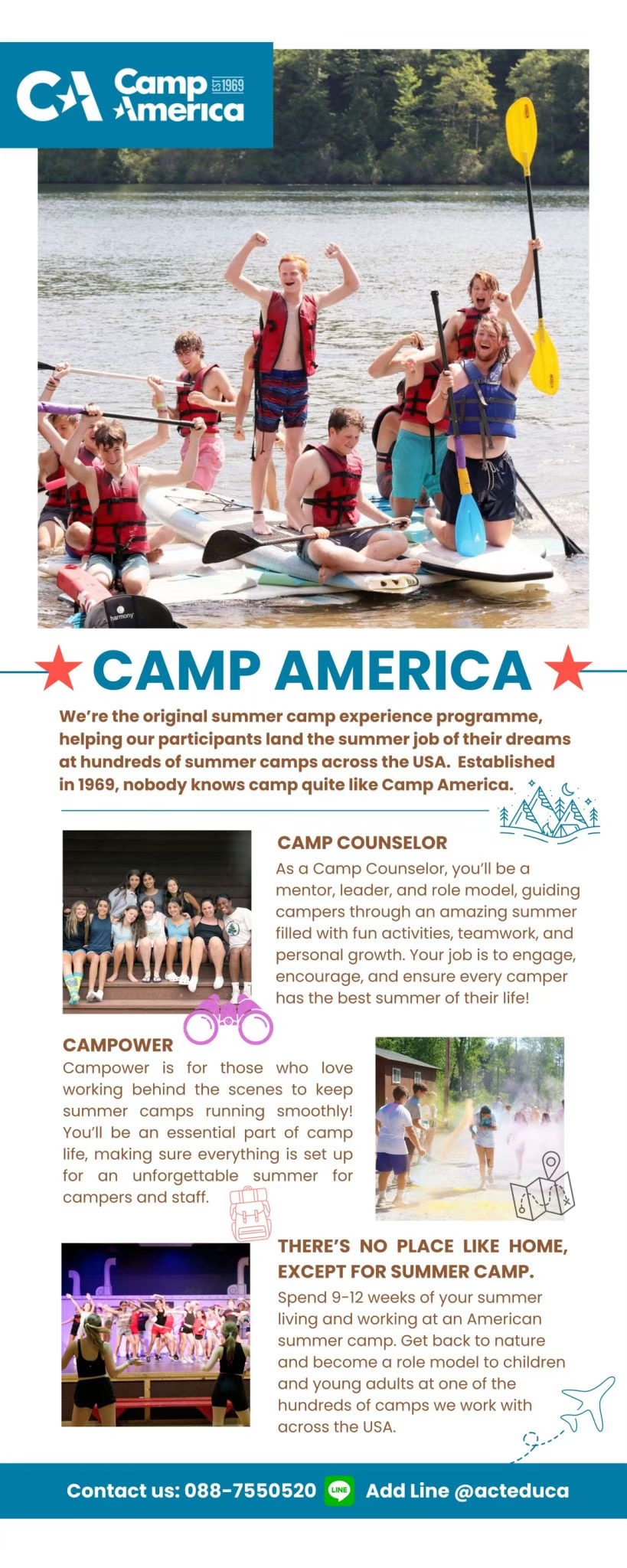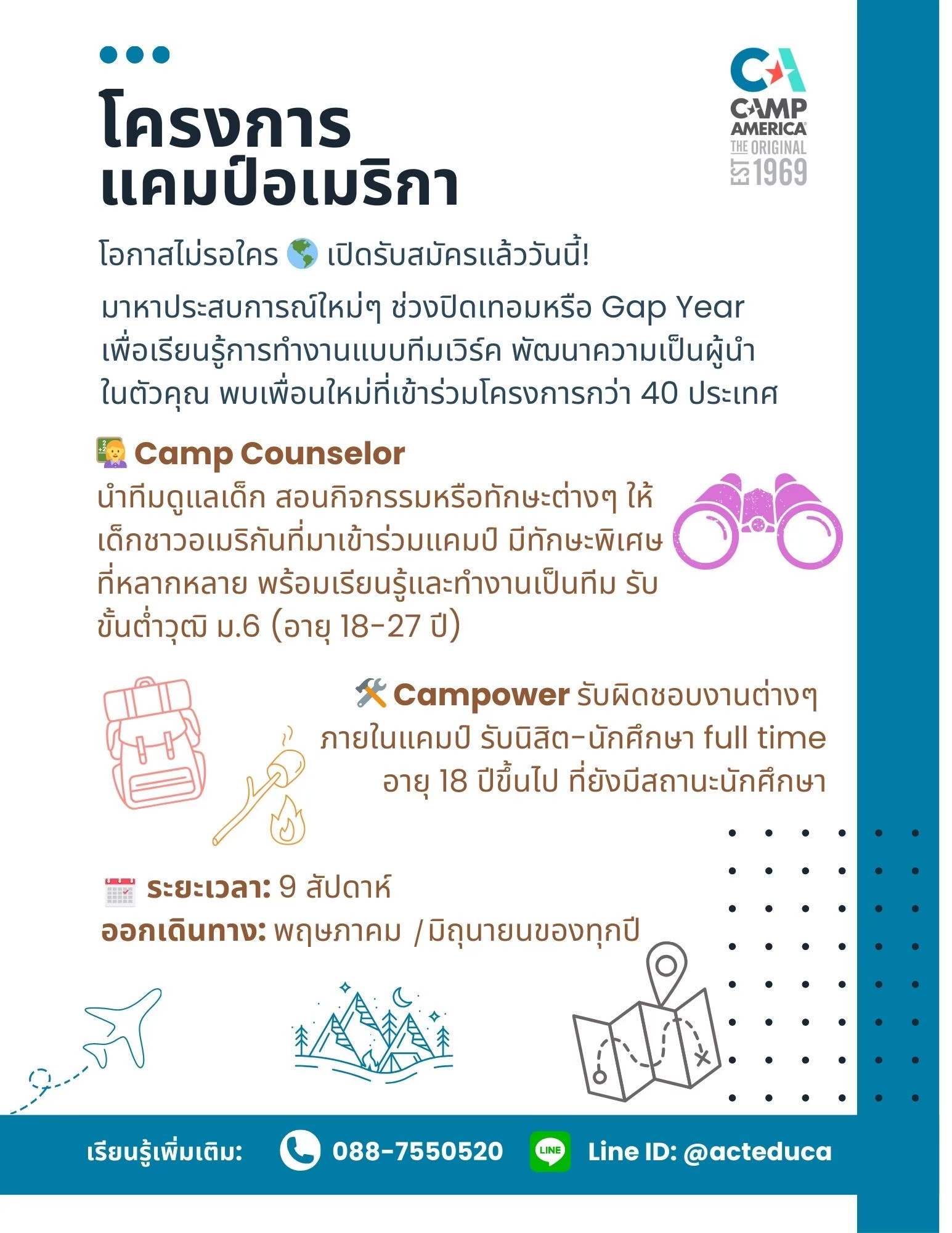 สนใจรับข้อมูลโครงการ CAMP AMERICA เพื่อเตรียมออกเดินทางในช่วงซัมเมอร์ปี 2026 ลงทะเบียนและทักหาเราได้ที่ Line Official Account!